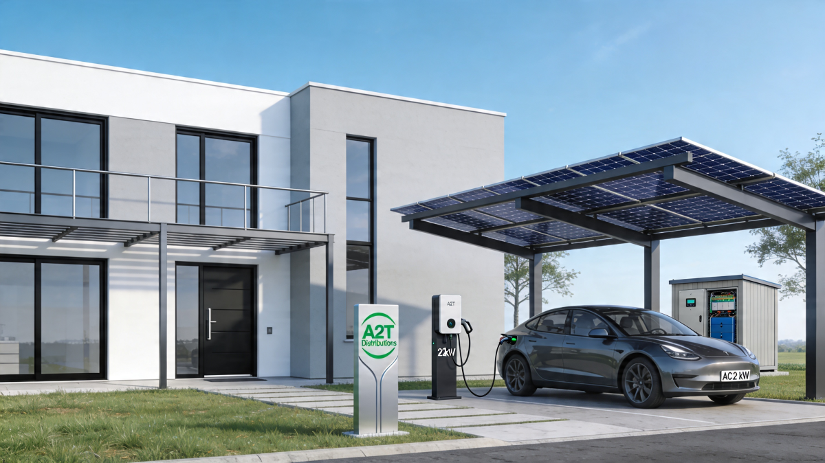 Projet architectural combinant menuiseries, carport solaire, stockage et recharge VE.